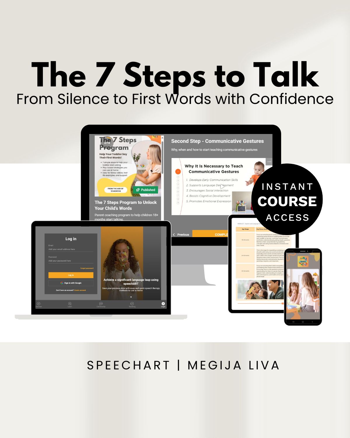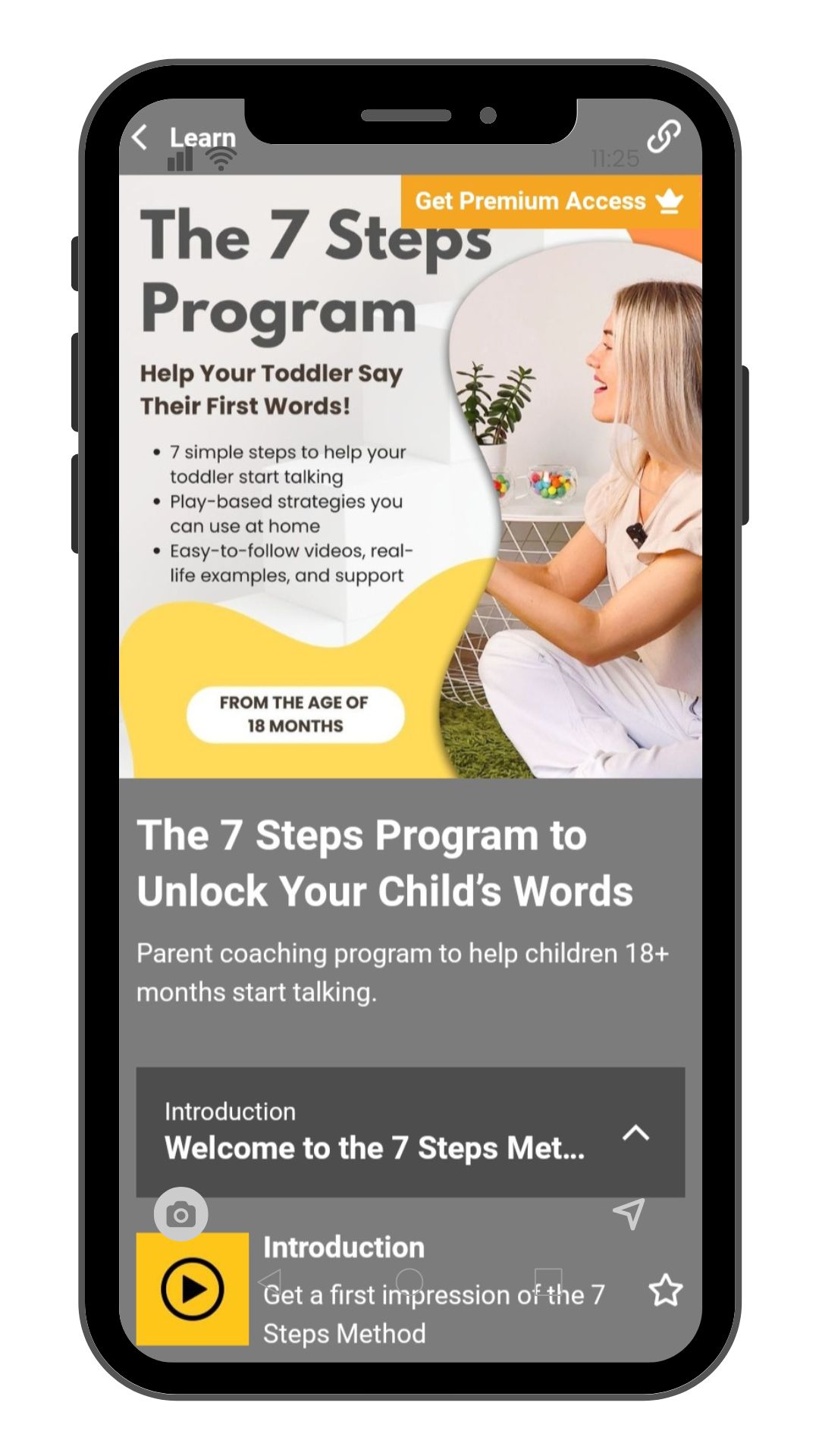 Once you sign up, you’ll get immediate access to The 7 Steps to Talk via an app. You can easily log in from any device, whether it’s your computer, tablet, or phone, and start the lessons right away. Everything is available at your fingertips—video lessons, worksheets, and resources—so you can get started whenever it's convenient for you. You can access the course at your own pace, whenever you have time to dedicate to helping your child!